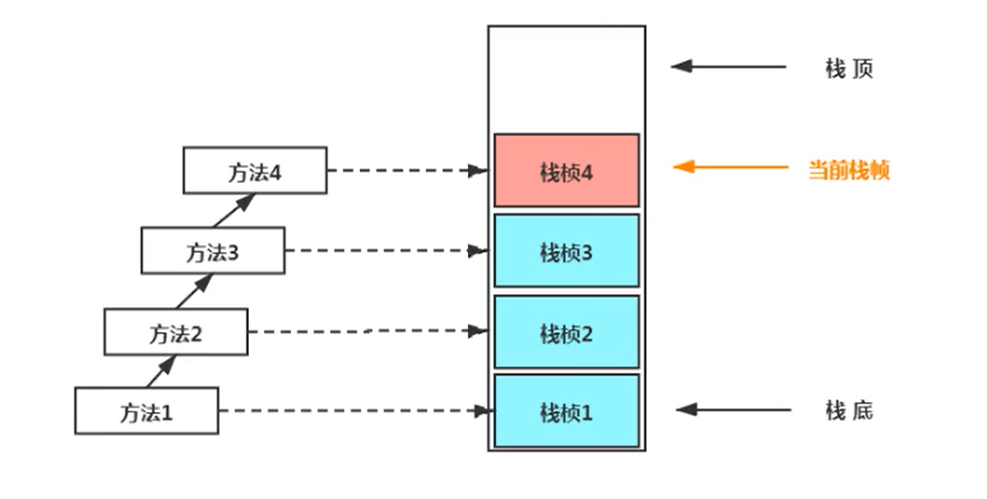 - 如果在该方法中调用了其他方法,对应的新的栈帧会被创建出来,放在栈的顶端,成为新的当前帧。