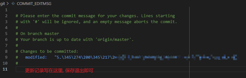 新版本的VS Code把更新记录放在了COMMIT EDITMSG文件夹里面,你只需要把更新记录写在这个文件里面保存,退出,最后选择同步即可。