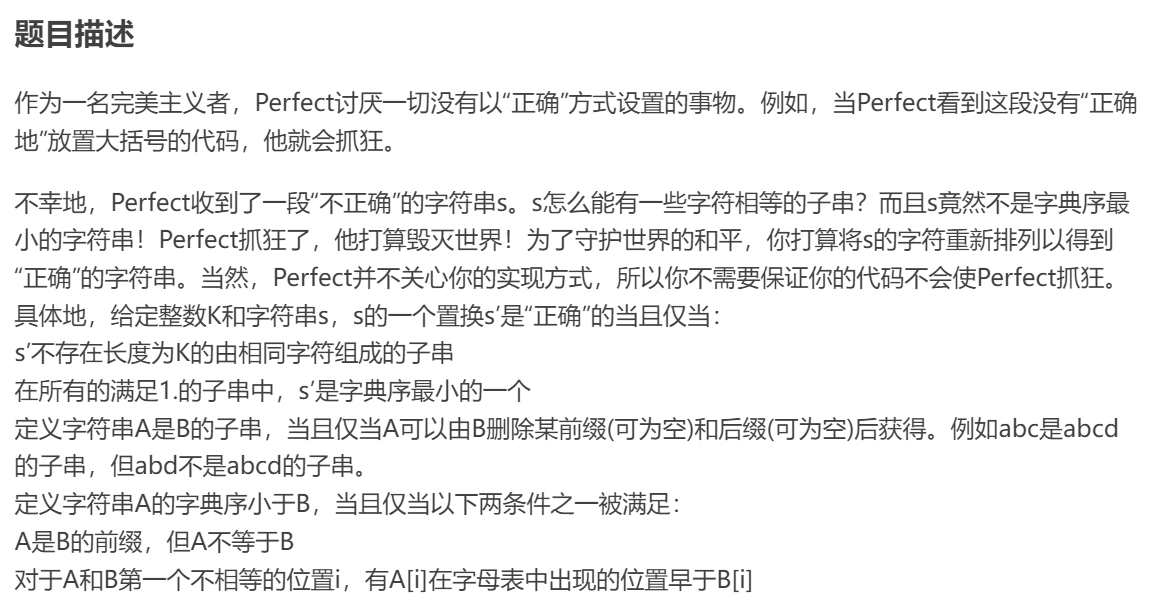 这是一道构造题,可以采用一种贪心的策略:尽可能把同种字典序小的字母往前排,最多排k-1个,等到排满的时候,再放一个字典序大于且仅大于这种字母的字母来隔一下避免子串长度超出即可。