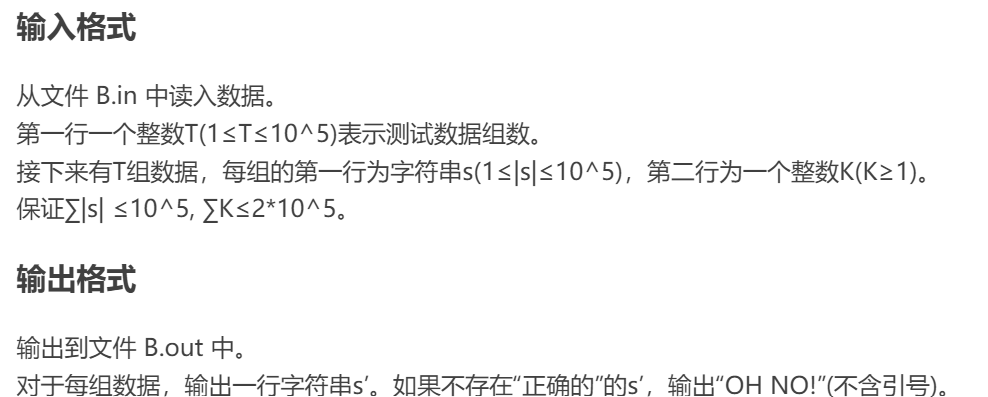 1 #include <bits/stdc++.h> 2 #define N (int)1e5+10 3 using namespace std; 4 char s[N]; 5 int n, k, cnt[26],num_c, last_c, sum,old_num_c, old_last_c; 6 bool check() { 7 bool flag = true; 8 for (int i = 0; i < 26; i++) if (cnt[i]) { 9 if (last_c == i) flag &= cnt[i] <= 1LL * (sum - cnt[i]) * (k - 1) + (k - 1 - num_c); 10 else flag &= cnt[i] <= 1LL * (sum - cnt[i] + 1) * (k - 1); 11 } 12 return flag; 13 } 14 void solve() { 15 cin>>s>>k; 16 n = strlen(s); 17 memset(cnt, 0, sizeof(cnt)); 18 for (int i = 0; i < n; i++) cnt[s[i] - 'a'] += 1; 19 last_c = -1, sum = n; 20 if (k == 1 || !check()) {puts("OH NO!");return;} 21 for (int i = 0; i < n; i++) { 22 sum -= 1; 23 for (int j = 0; j < 26; j++) if (cnt[j]) { 24 if (last_c == j && num_c + 1 == k) continue; 25 cnt[j] -= 1; 26 old_num_c = num_c,old_last_c = last_c; 27 if (last_c == j) num_c += 1; 28 else {last_c = j;num_c = 1;} 29 if (check()) {printf("%c", j + 'a');break;} 30 cnt[j] += 1; 31 num_c = old_num_c,last_c = old_last_c; 32 } 33 } 34 puts(""); 35 } 36 37 int main() { 38 freopen("B.in", "r", stdin); 39 freopen("B.out", "w", stdout); 40 int T; 41 cin>>T; 42 while (T--) solve(); 43 return 0; 44 }