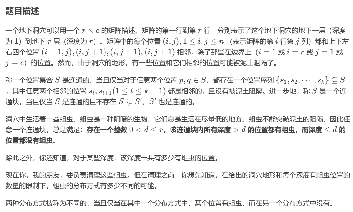 其实,现在回头看一下,这道题其实就是一道很直接的状压DP,考虑预处理每个连通块在每个深度上的位置数量,从下向上d,设f(i,S)表示在深度i,集合S中的连通块在该深度有蛆虫。转移的时候S可以向其一个子集转移。注意到每个连通块根据其最浅深度与当前是否有蛆虫两个信息,可判断在深度i-1要么必须没蛆虫,要么可有蛆虫可无蛆虫。转移之后,根据xi的限制将不合法的状态清空。使用高维前缀和的方法转移,复杂度O(r·k·2k),其中k是连通块个数。