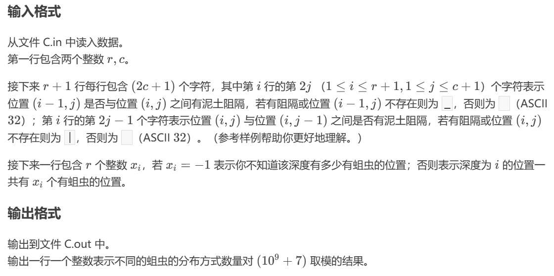 1 #include <bits/stdc++.h> 2 using namespace std; 3 const int maxn = 25,maxm = 405,INF = 1e9 + 7; 4 int vis[maxn][maxn], cdep[maxn][maxn], ok[maxn][maxn], mn[maxn], mx[maxn], lim[maxn],r, c, tot,num[1 << 25], f[1 << 25]; 5 vector<pair<int, int> > g[maxn][maxn]; 6 vector<pair<int, int> > vec[maxn]; 7 string buf; 8 inline void dfs(int x, int y, int id){ 9 vis[x][y] = 1; 10 vec[id].push_back(make_pair(x, y)); 11 for(auto p: g[x][y]) if(!vis[p.first][p.second]) dfs(p.first, p.second, id); 12 } 13 inline void dfs2(int x, int y, int dep){ 14 vis[x][y] = 1; 15 for(auto p: g[x][y]) if(p.second >= dep && !vis[p.first][p.second]) dfs2(p.first, p.second, dep); 16 } 17 inline int &add(int &x, const int &y){ return (x += y) -= (x >= INF ? INF : 0); } 18 int main(){ 19 freopen("C.in", "r", stdin); 20 freopen("C.out", "w", stdout); 21 cin >> r >> c; 22 getline(cin, buf); 23 for(int i = 0; i < r + 1; ++i){ 24 getline(cin, buf); 25 if(!i) continue; 26 for(int j = 0; j < c * 2 + 1; ++j){ 27 int x = i - 1, y = j / 2; 28 if(j % 2 == 0 && buf[j] != '|'){ 29 g[x][y].push_back(make_pair(x, y - 1)); 30 g[x][y - 1].push_back(make_pair(x, y)); 31 } 32 if(j % 2 == 1 && buf[j] != '_'){ 33 g[x][y].push_back(make_pair(x + 1, y)); 34 g[x + 1][y].push_back(make_pair(x, y)); 35 } 36 } 37 } 38 for(int i = 0; i < r; ++i) for(int j = 0; j < c; ++j) if(!vis[i][j]){dfs(i, j, tot);++tot;} 39 memset(mn, 0x3f, sizeof(mn)); 40 for(int i = 0; i < tot; ++i) 41 for(int j = 0; j < r; ++j) 42 for(int k = 0; k < vec[i].size(); ++k) if(vec[i][k].first == j) ++cdep[i][j], mx[i] = max(mx[i], j), mn[i] = min(mn[i], vec[i][k].first); 43 for(int i = 0; i < r; ++i) scanf("%d", lim + i); 44 lim[r] = -1; 45 for(int S = 0; S < (1 << tot); ++S) f[S] = 1; 46 for(int i = r; i >= 0; --i){ 47 if(~lim[i]){ 48 num[0] = 0; 49 if(num[0] != lim[i]) f[0] = 0; 50 for(int S = 1; S < (1 << tot); ++S){ 51 int b = __builtin_ctz(S); 52 num[S] = num[S ^ (1 << b)] + cdep[b][i]; 53 if(num[S] != lim[i]) f[S] = 0; 54 } 55 } 56 if(i == 0) break; 57 for(int j = 0; j < tot; ++j) 58 for(int S = 0; S < (1 << tot); ++S) 59 if(S >> j & 1){ // dep >= i filled 60 if(mx[j] >= i) add(f[S ^ (1 << j)], f[S]); 61 if(i - 1 < mn[j]) f[S] = 0; 62 } 63 } 64 int ans = 0; 65 for(int S = 0; S < (1 << tot); ++S) add(ans, f[S]); 66 cerr << ans << endl; 67 printf("%d\n", ans); 68 return 0; 69 }