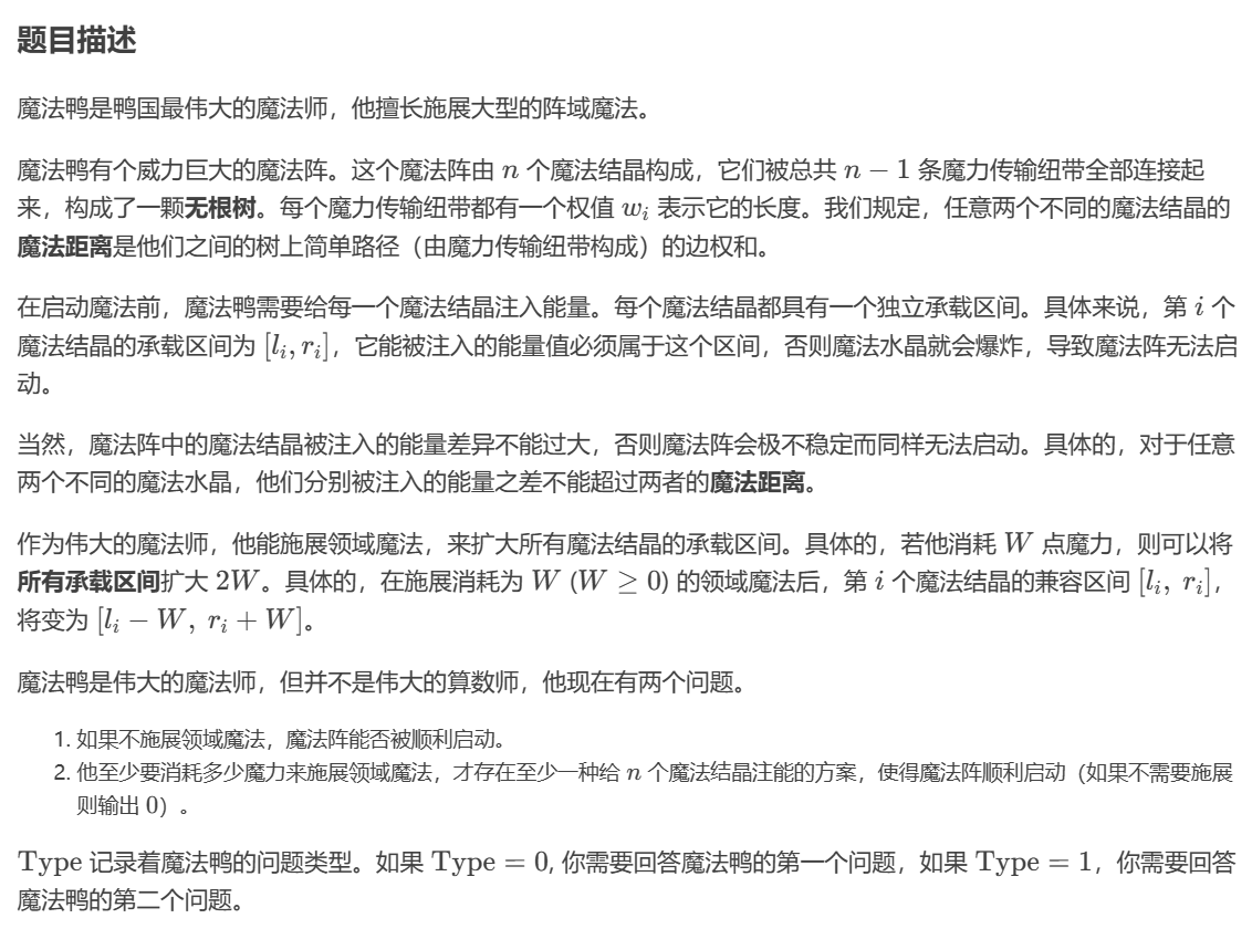 1 #include <bits/stdc++.h> 2 #define maxn 1000010 3 #define ll long long 4 #define fi first 5 #define se second 6 #define pb push_back 7 #define eb emplace_back 8 #define pii pair<int, int> 9 using namespace std; 10 11 int a[maxn], b[maxn], n, type; 12 ll f[maxn], g[maxn], ans; 13 const ll INF = 1LL << 60; 14 vector<pii> nxt[maxn]; 15 template <class T> void read(T &x) { 16 char ch = x = 0; 17 bool fl = false; 18 while (!isdigit(ch)) 19 fl |= ch == '-', ch = getchar(); 20 while (isdigit(ch)) 21 x = x * 10 + ch - '0', ch = getchar(); 22 x = fl ? -x : x; 23 } 24 void clear() { 25 for (int i = 1; i <= n; i++) { 26 nxt[i].clear(); 27 } 28 ans = 0; 29 } 30 void dfs(int x, int fa, ll dis) { 31 f[x] = -dis - b[x], g[x] = -dis + a[x]; 32 for (auto &y : nxt[x]) { 33 if (y.fi != fa) { 34 dfs(y.fi, x, dis + y.se); 35 ans = max(ans, max(f[x] + g[y.fi], g[x] + f[y.fi]) + 2LL * dis); 36 f[x] = max(f[x], f[y.fi]), g[x] = max(g[x], g[y.fi]); 37 } 38 } 39 } 40 void solve() { 41 read(n), clear(); 42 for (int i = 1; i <= n; i++) { 43 read(a[i]); 44 assert(-1e9 <= a[i] && a[i] <= 1e9); 45 } 46 for (int i = 1; i <= n; i++) { 47 read(b[i]); 48 assert(-1e9 <= b[i] && b[i] <= 1e9); 49 } 50 for (int i = 1, u, v, w; i < n; i++) { 51 read(u), read(v), read(w), nxt[u].eb(v, w), nxt[v].eb(u, w); 52 } 53 dfs(1, 0, 0); 54 printf("%lld\n", !type ? !!ans : ans + 1 >> 1); 55 } 56 int main() { 57 freopen("D.in", "r", stdin); 58 freopen("D.out", "w", stdout); 59 int T; 60 for (read(T), read(type); T--; solve()); 61 return 0; 62 }