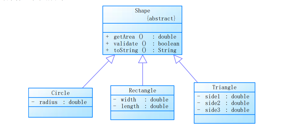 题目集6(7-5)相比题目集4(7-3)多了多态的使用。采用的是抽象类定义、实体类构建的方式。Shape 为抽象类,其中包含抽象的求面积的方法,判断数据合理性的方法和将其他数据类型转换为字符串String类型的方法。Circle、Rectangle 及 Triangle 为实体类继承自Shape类,子类通过重写父类的抽象方法求图形面积。这道题运用了类的封装、继承与多态。