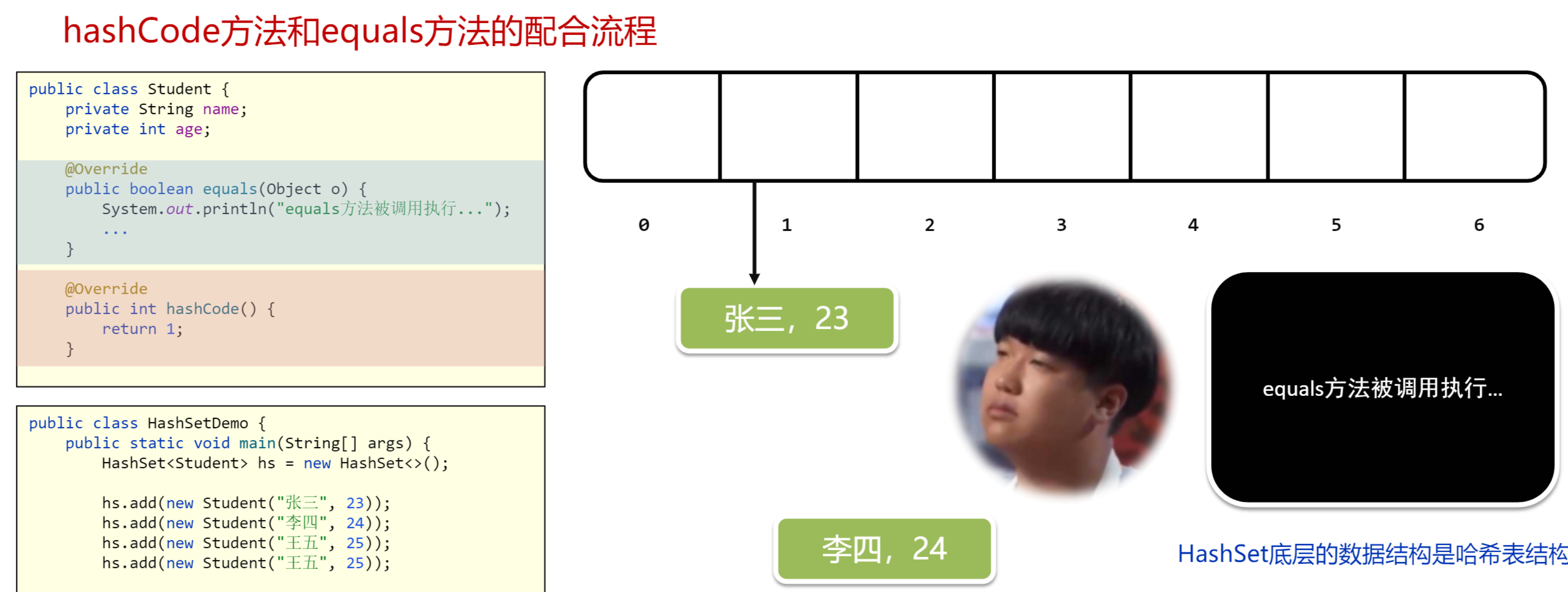 以此类推,将所有不同的对象都存在了1号索引,多出的王五因为equals方法将被去重