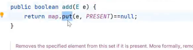 光知道这些还不够,我们需要了解清楚add方法内部究竟干了什么,进入add方法内部,发现add方法调用了put方法,是在这里面做的添加