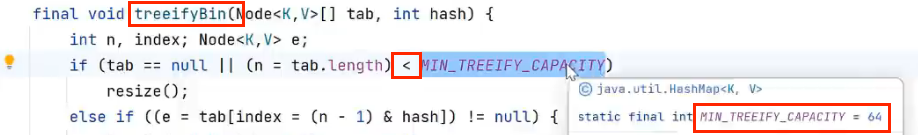 如图,treeifyBin即树化操作,会判断数组长度是否到达64,未到达64,则会继续扩容数组,到达了64则会转红黑树