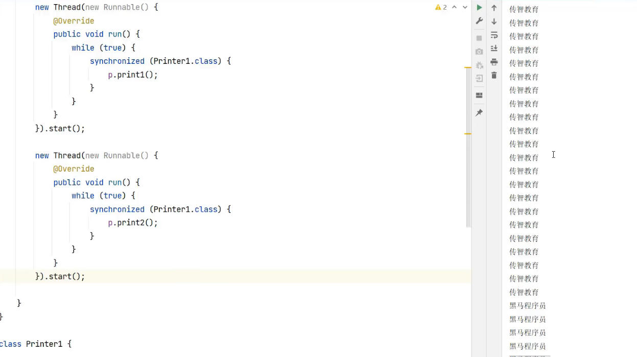 可以看见,上图中,控制台没有错乱的语句,但如果我们要让传智教育和黑马程序员一人一句的打印,该怎么做?