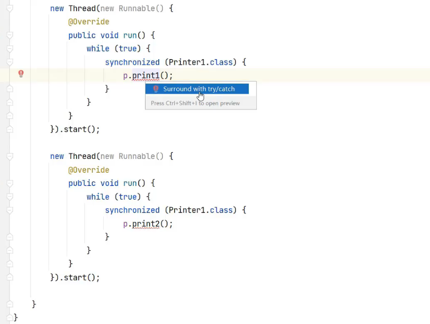 因为我们在print方法里抛出了异常,所以在run方法里也报错了,但是系统提示我们只能try catch