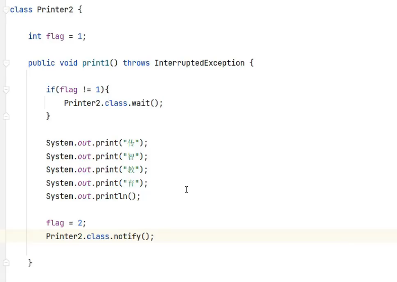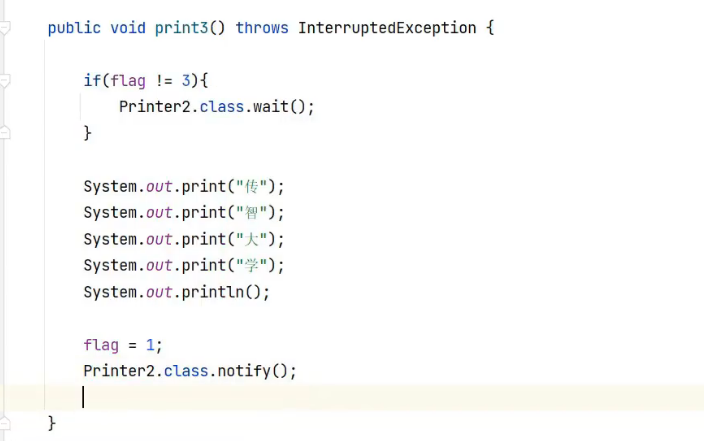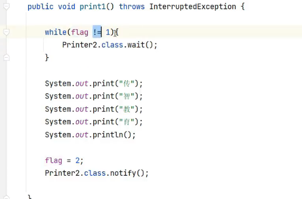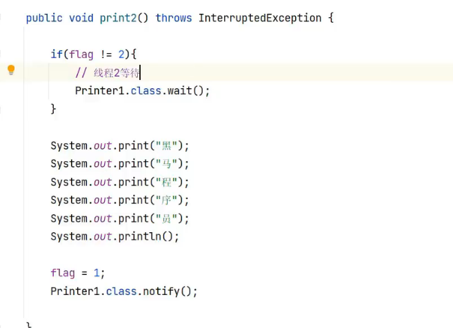 在print01的开头就判断,如果flag不等于1,那么就让线程1等待,为1,就执行打印语句,之后再把flag赋值为2,并且唤醒线程2
