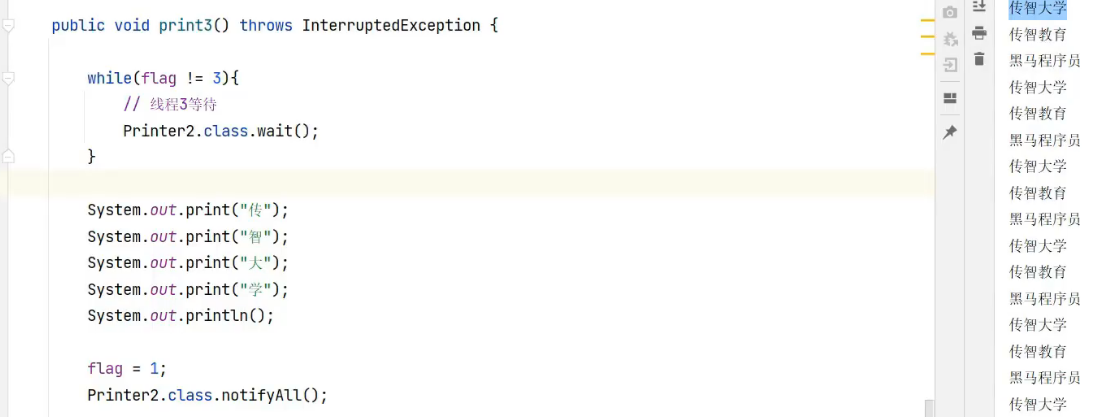 1.假设线程1拿到执行权,走print01,flag初始为1,线程1打印传智教育