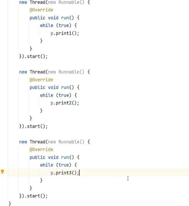 接着,我们创建该类的对象作为资源对象,然后实现Runnable接口开启两条线程(共享该资源对象),两条线程分别打印print1和print2