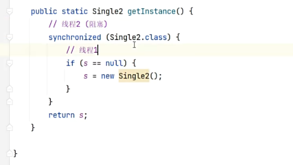 线程1执行完毕后,回到最外面,此时s已经创建好了,即便线程1抢到执行权也不满足第一个if的条件,不会再继续进入内部上锁