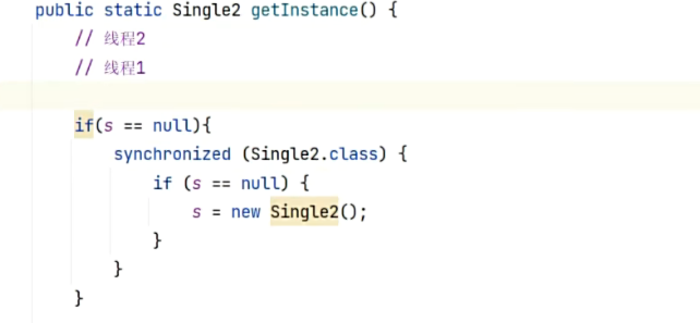假设线程1抢到执行权,s初始为null,进入if内部,此时,线程2抢到执行权,也进入if内部