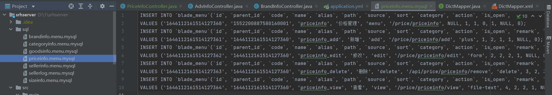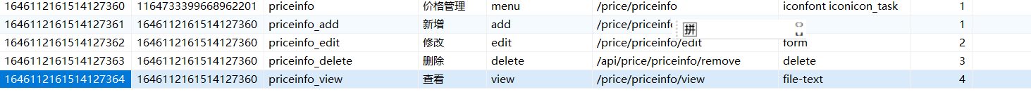 数据库添加价格表t_price_info 将数据添加到菜单数据库blade_menu
