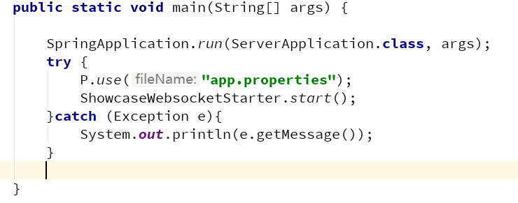 在ShowCaseWebSocketStarter 这个类里面有启动类。因为我们的项目是基于springboot 所以我直接把启动的代码拿到springboot启动类里面和它一起启动。