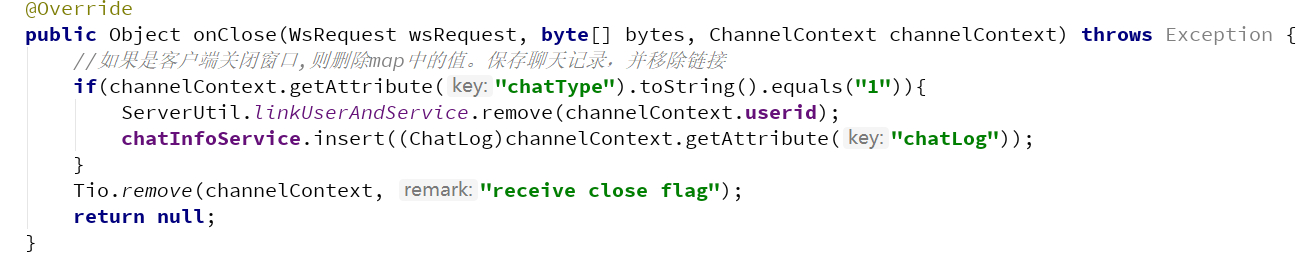 第七步:业务结束处理。比如可以在聊天结束后将聊天记录保存至数据库。这里我做了判断。只有客户关闭客户端的时候进行保存。使用MAP保存了用户和客服的对应列表。因为了解不到别人是如何做的。这个方法是我想到的比较好的实现了。