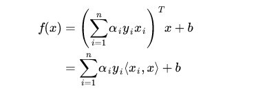 ,在进行分类的时候,将新的数据点x代入f(x) 中,如果f(x)小于0则将x的类别赋为-1,如果f(x)大于0则将x的类别赋为1,f(x)=0就没法分了。SVM的求解就是要求出向量w和常量b,而求解过程通过转换成拉格朗日函数,最终可以转化成下述目标函数,可以利用求解对偶问题的序列最小最优化SMO算法计算出拉格朗日因子,再计算出w和b。详细的数学推导过程这里就不再累述了,这里只在前人的基础上给出更为直观的求解表达式。
