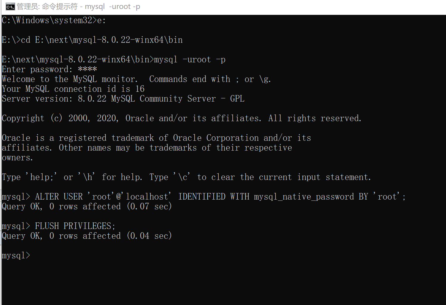 输入 ALTER USER 'root'@'localhost' IDENTIFIED WITH mysql_native_password BY '修改后的mysql密码'; (我修改的密码是root)