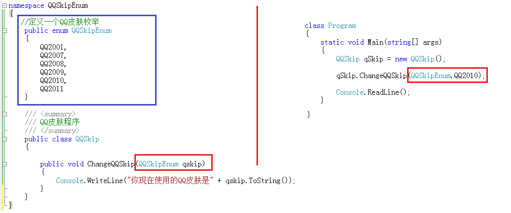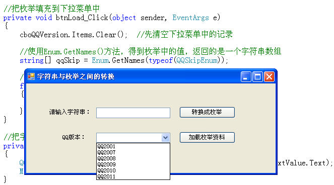 使用该枚举来接收,如下: QQSkipEnum qprase= (QQSkipEnum)Enum.Parse(typeof(QQSkipEnum) , strValue); 这样就把字符串转换成枚举类型成功,以上的代码相对于复杂一点, 但在实际的开发过程当中,是必不可少的,所以务必要记住