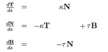 其中ds是对弧长的微分, κ 为曲线的曲率,τ 为曲线的挠率。弗莱纳公式描述了空间曲线曲率挠率的变化规律