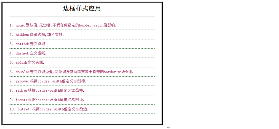 CSS规定了 dotted、dashed、solid等九种边框样式,如下