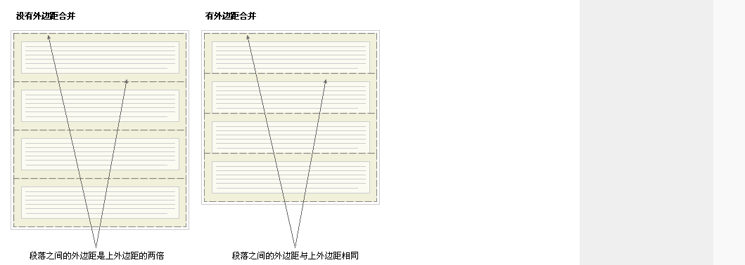 这就是一系列的段落元素占用空间非常小的原因,因为它们的所有外边距都合并到一起,形成了一个小的外边距。