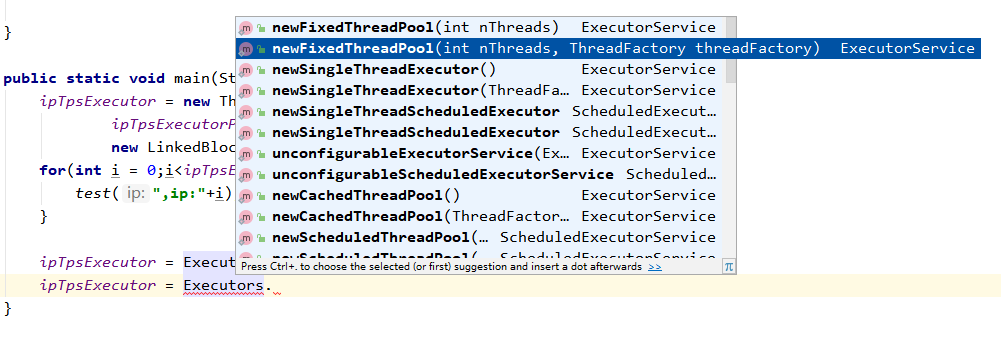 import java.util.Date; import java.util.concurrent.*; public class Test { //线程池 线程数目 private static int ipTpsExecutorPoolCoreSize = 5; //线程池 最大排队数量,当请求过多时阻塞调用线程 private static int ipTpsExecutorPoolMaxSize = 5; //线程池 private static ExecutorService ipTpsExecutor; public static void test(final String ip) { ipTpsExecutor.execute(new Runnable() { @Override public void run() { System.out.println(Thread.currentThread().getName()+ip); } }); } public static void main(String[] args) { ipTpsExecutor = new ThreadPoolExecutor(ipTpsExecutorPoolCoreSize, ipTpsExecutorPoolMaxSize, 0L, TimeUnit.MILLISECONDS, new LinkedBlockingQueue<Runnable>()); System.out.println("自定义ThreadPoolExecutor开始"+new Date()); for(int i = 0;i<ipTpsExecutorPoolMaxSize+10;i++) { test(",ip:"+i); } ScheduledExecutorService scheduledExecutorService = Executors.newScheduledThreadPool(3); System.out.println("newScheduledThreadPool,延迟3s开始"+new Date()); scheduledExecutorService.schedule(new Runnable() { @Override public void run() { System.out.println("schedule run "+new Date()); } }, 3, TimeUnit.SECONDS); ScheduledExecutorService es = Executors.newScheduledThreadPool(5); System.out.println("newScheduledThreadPool,延迟2s开始时间每三秒执行一次"+new Date()); Runnable syncRunnable = new Runnable() { @Override public void run() { System.out.println(Thread.currentThread().getName()+new Date()); } }; es.scheduleAtFixedRate(syncRunnable, 2000, 3000, TimeUnit.MILLISECONDS); } }