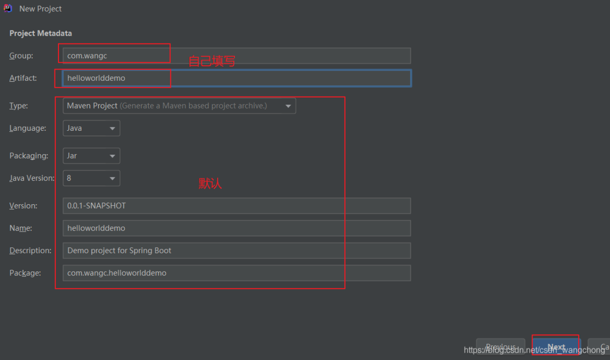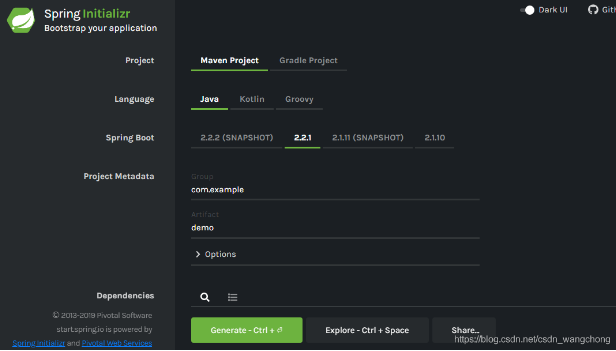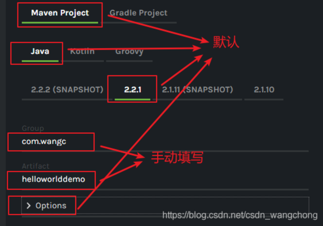 这里默认使用maven构建,语言是Java,springboot的版本是2.2.1