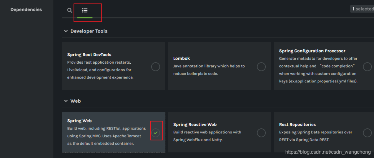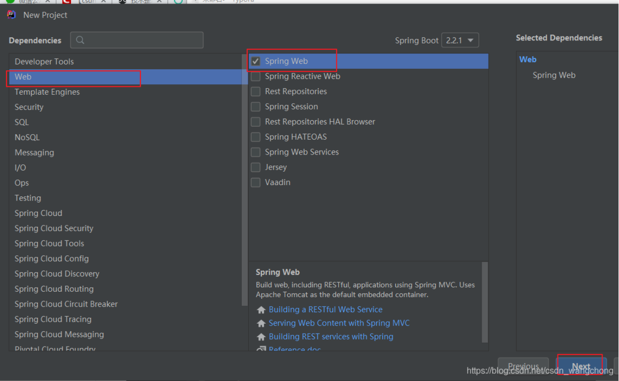 在往下选上依赖模块包, Spring Web 这个模块是我们必须的一个依赖