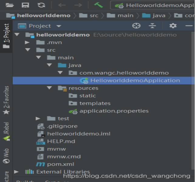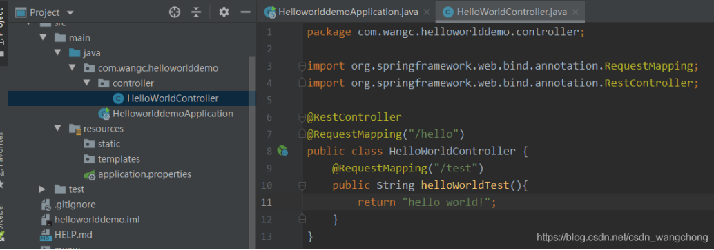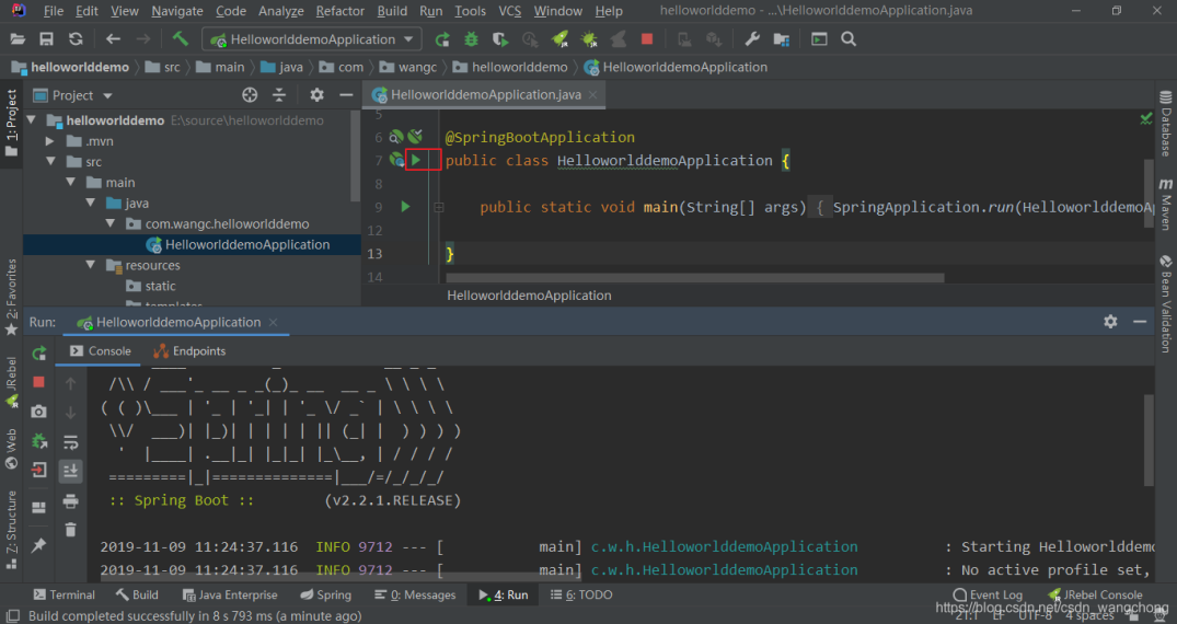 HelloworlddemoApplication是项目的启动类,我们直接运行它就可以直接启动项目