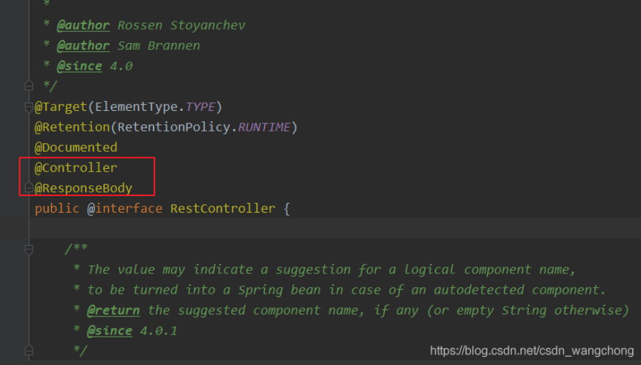 - @RestController是Spring 4 之后新加的注解,相当于Spring 4之前的 @Controller +@ResponseBody 源码如下: