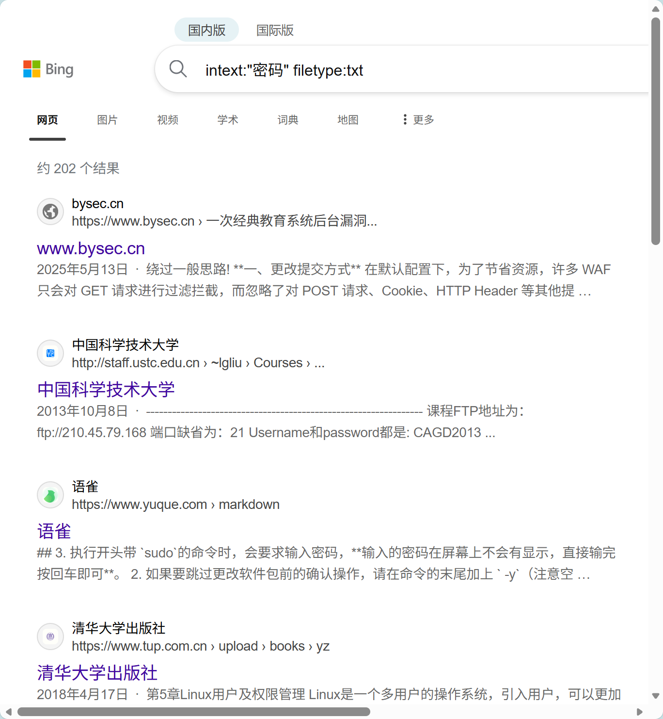 示例:intext:"密码" filetype:txt