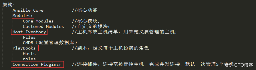 - Core Modules:Ansible执行任何管理任务都不是由Ansible自己完成,而是由核心模块完成;Ansible管理主机之前,先调用core Modules中的模块,然后指明管理Host Lnventory中的主机,就可以完成管理主机;