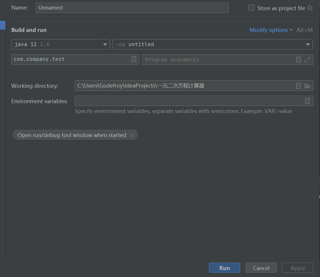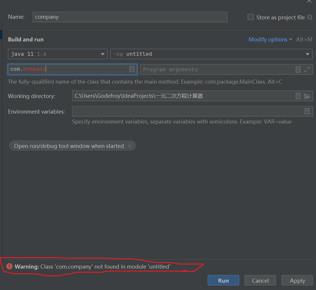 完成代码后,运行时候,发现软件报没有找到class的错,于是在配置edit configuration中写入了class名字,发现系统还是报无法找到。