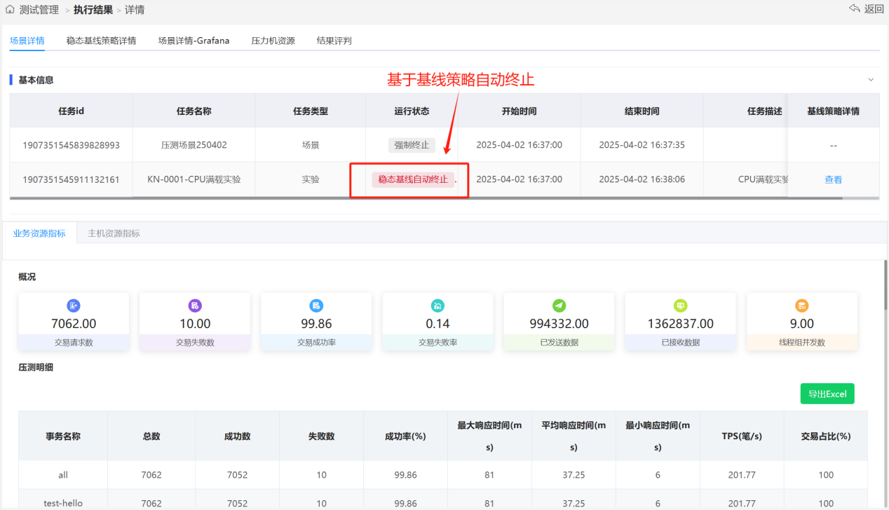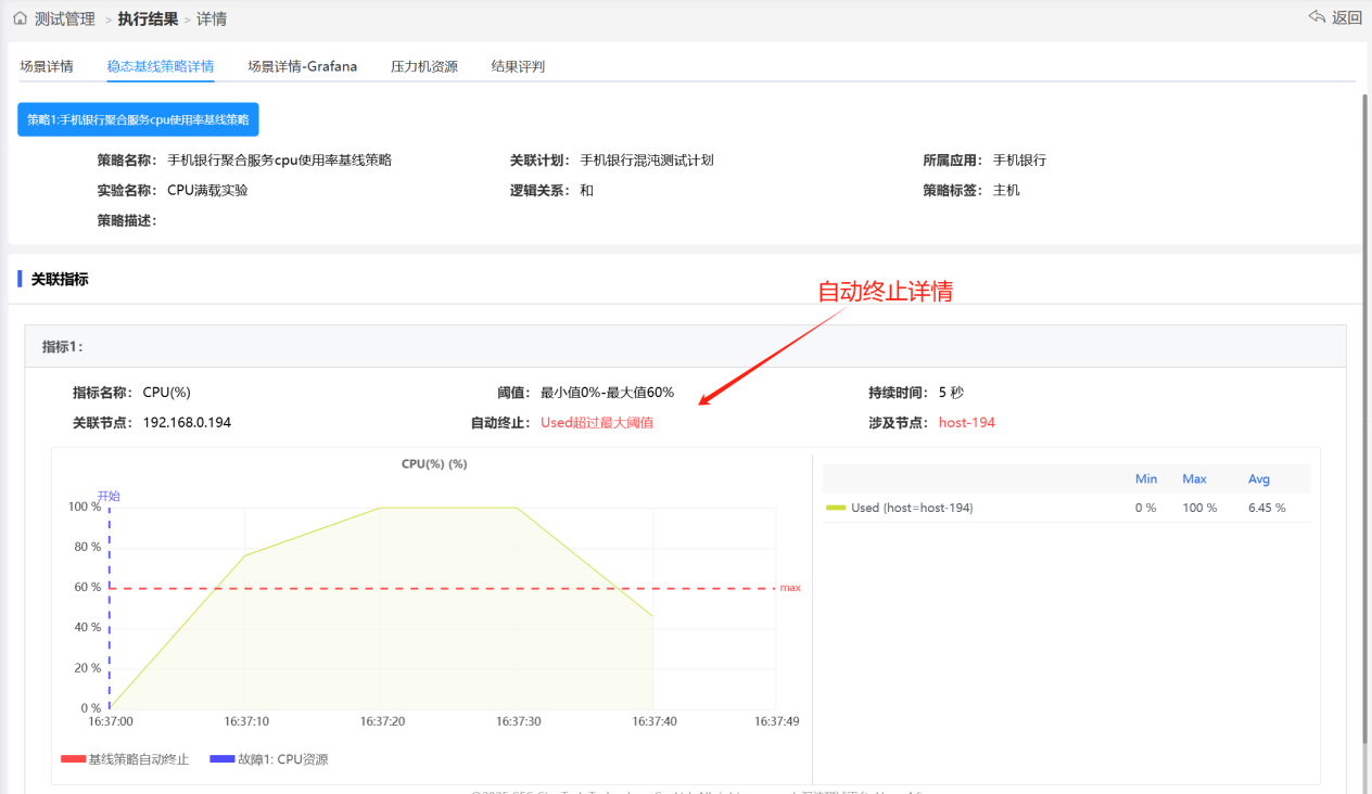 平台支持设置基线保护策略,支持在实验期间基于基线策略进行自动中止,以识别系统非稳态情况,从而防止故障在链路中失控蔓延,同时支持在触发自动中止后查看具体详情。