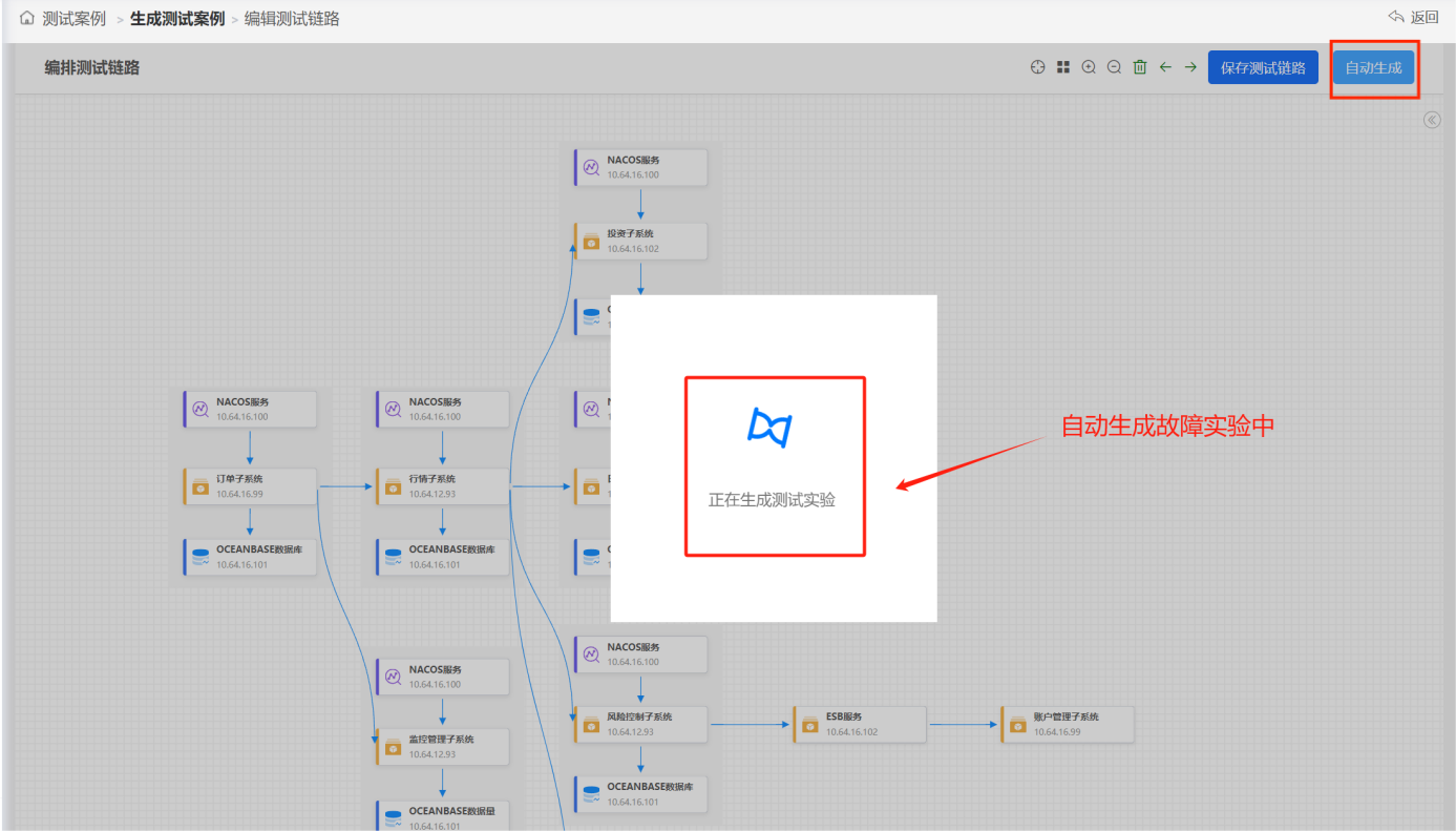 平台支持基于系统架构的拓扑关系自动生成批量故障实验。通过自动解析系统架构的类型、链路关系、节点属性等关键信息,平台可自动匹配相关原子故障,实现一键式批量故障实验的自动生成。