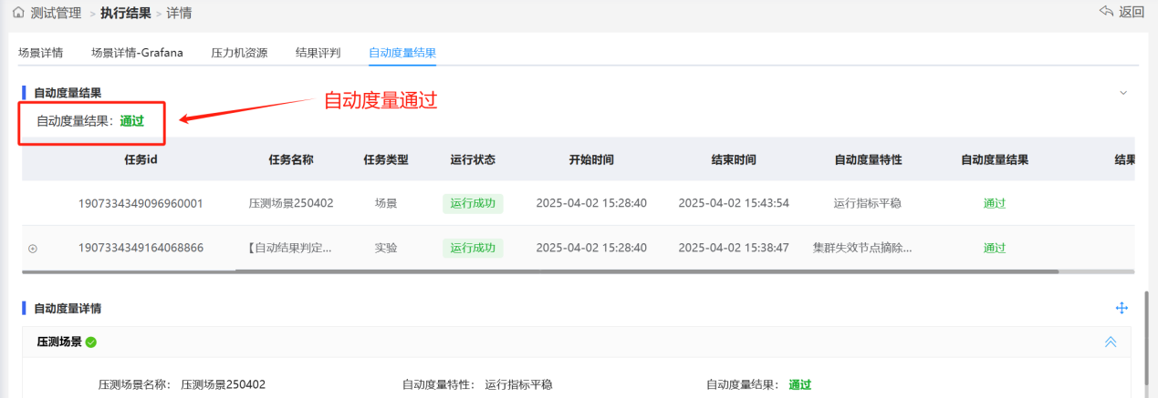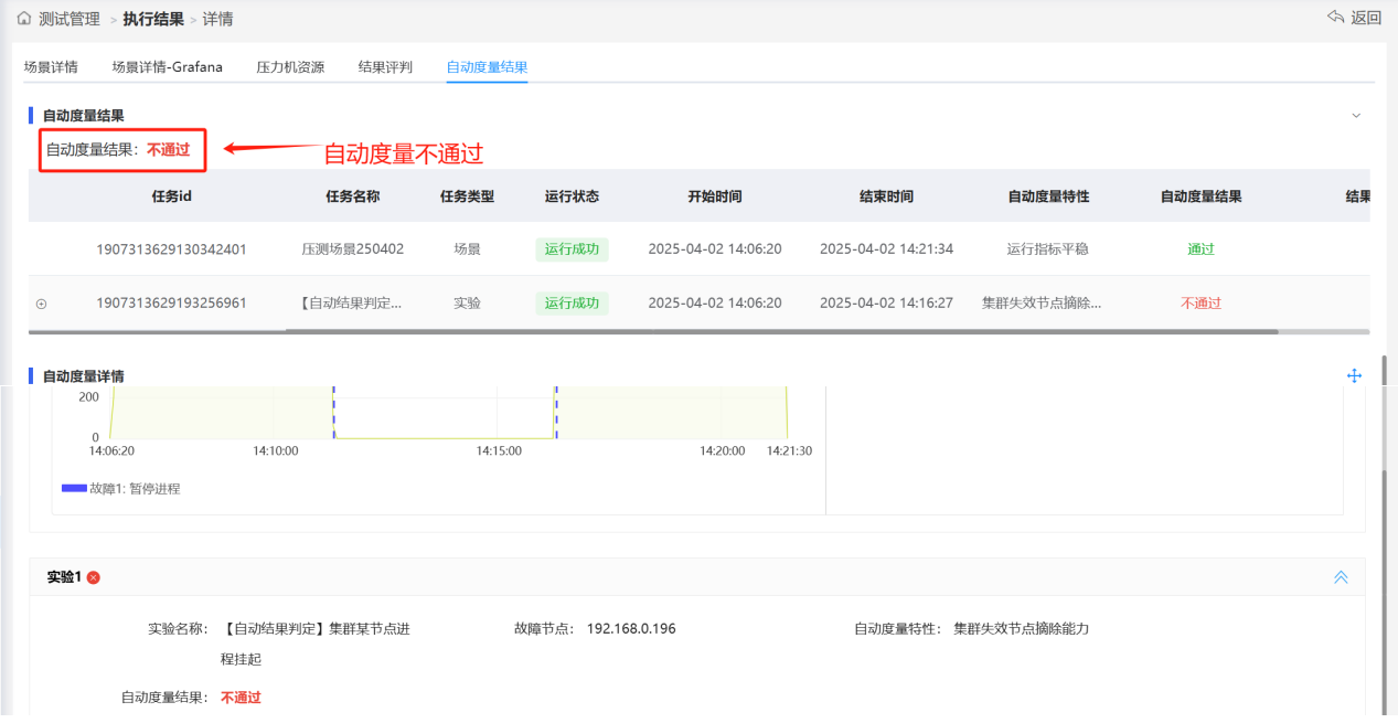 混沌工程实验的自动结果判定功能,支持用户在创建混沌工程实验时选择稳定性度量策略并设置度量规则。实验运行结束后,平台将根据规则对实验结果数据进行自动度量计算与分析,判定实验是否通过。