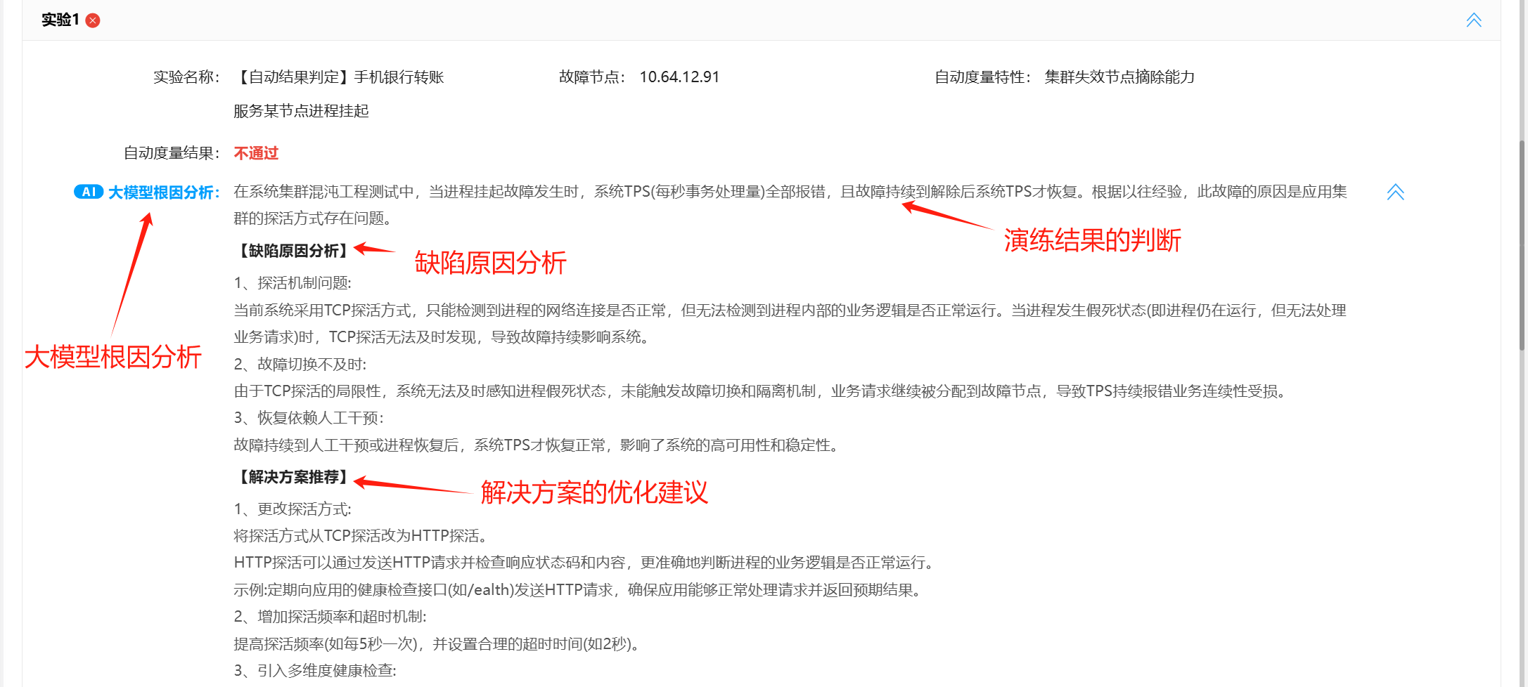 同时,源启混沌工程平台融合了AI大模型。在实验不通过时,平台会自动获取实验期间的结构化数据,并通过AI大模型给出实验结果的诊断结论及优化建议。