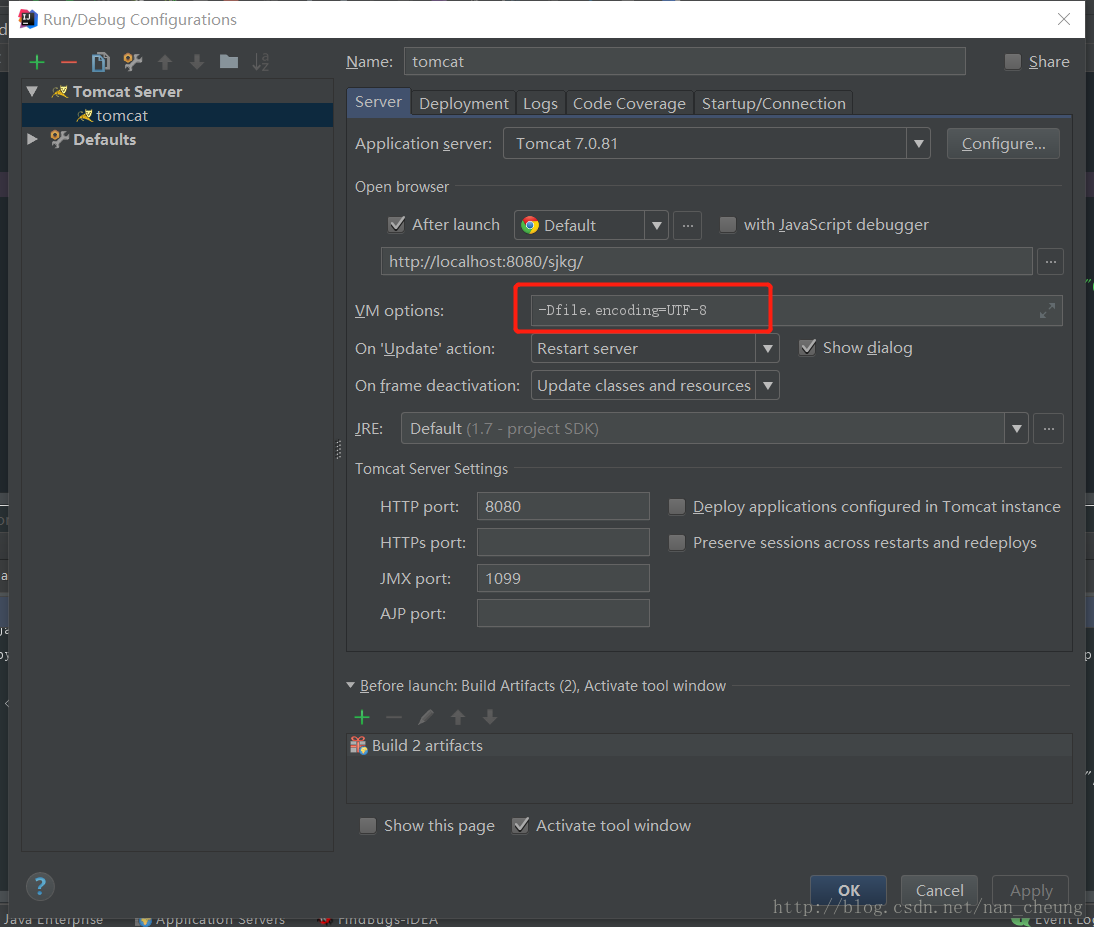 二. 配置tomcat的编码: Run -> Edit Configurations 在VM options填写 -Dfile.encoding=UTF-8