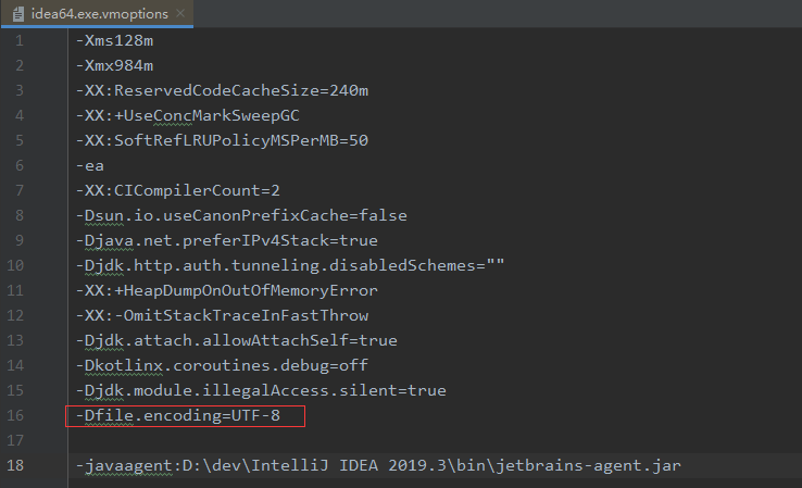 三.在 Help -> custom vm options 添加 -Dfile.encoding=UTF-8