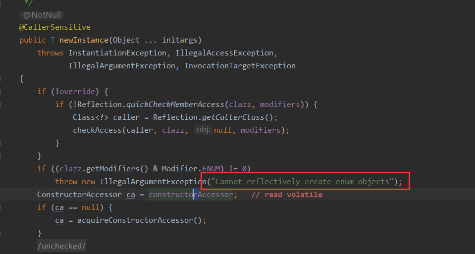 //(newInstance 源码)正常报错是:throw new IllegalArgumentException("Cannot reflectively create enum objects");