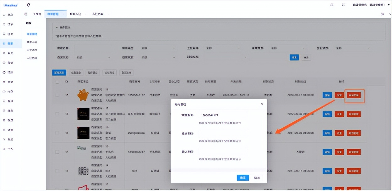 可以重置当前商家的管理员账号和密码,如果商家忘记了管理员账号密码,可以联系平台使用此功能重新设置。
