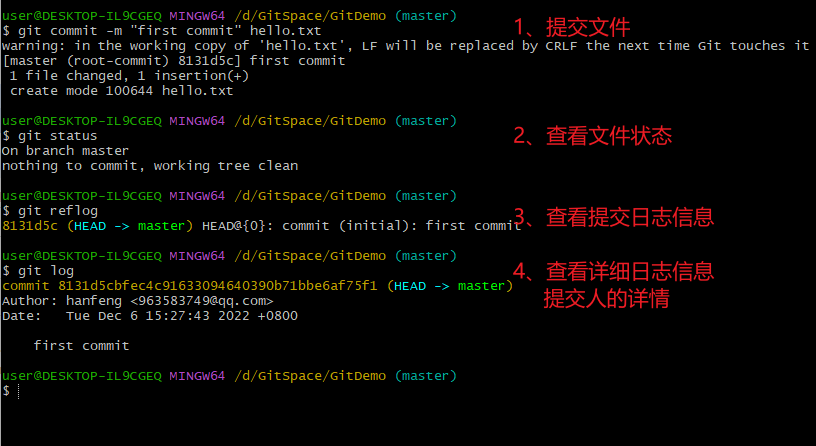 | git commit -m "日志信息" 文件名 | 提交到本地库 |