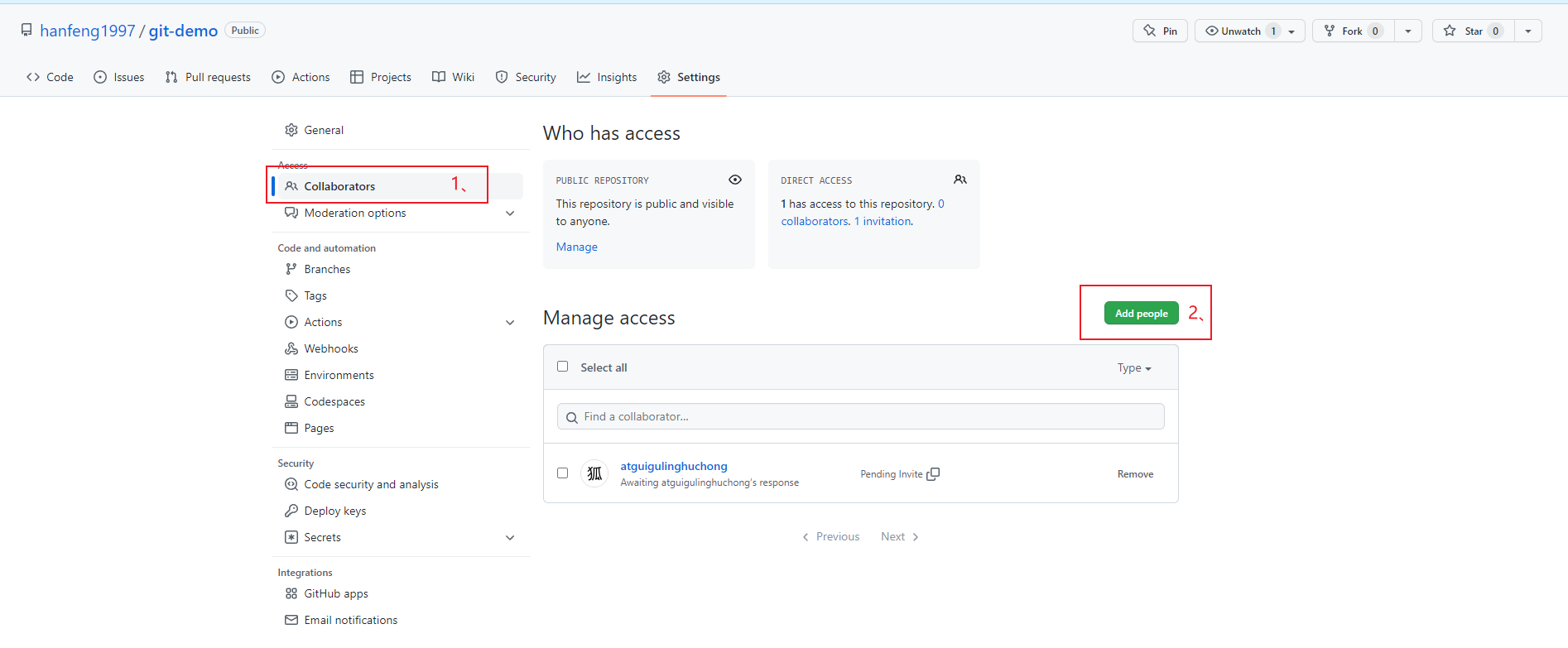 - 团队内协作github,在这里邀请其他人加入到当前项目中,下边会生成一个邀请码,把邀请码赋值给被邀请着就可以点击链接加入到你的项目团队中进行项目开发工作了