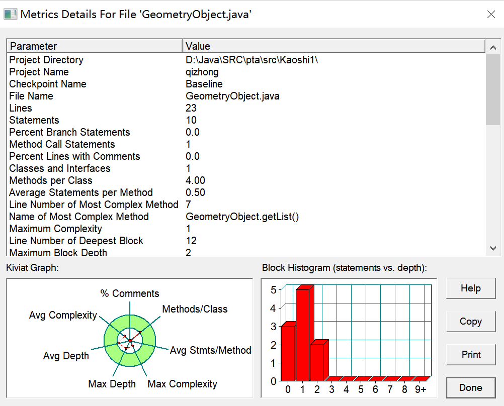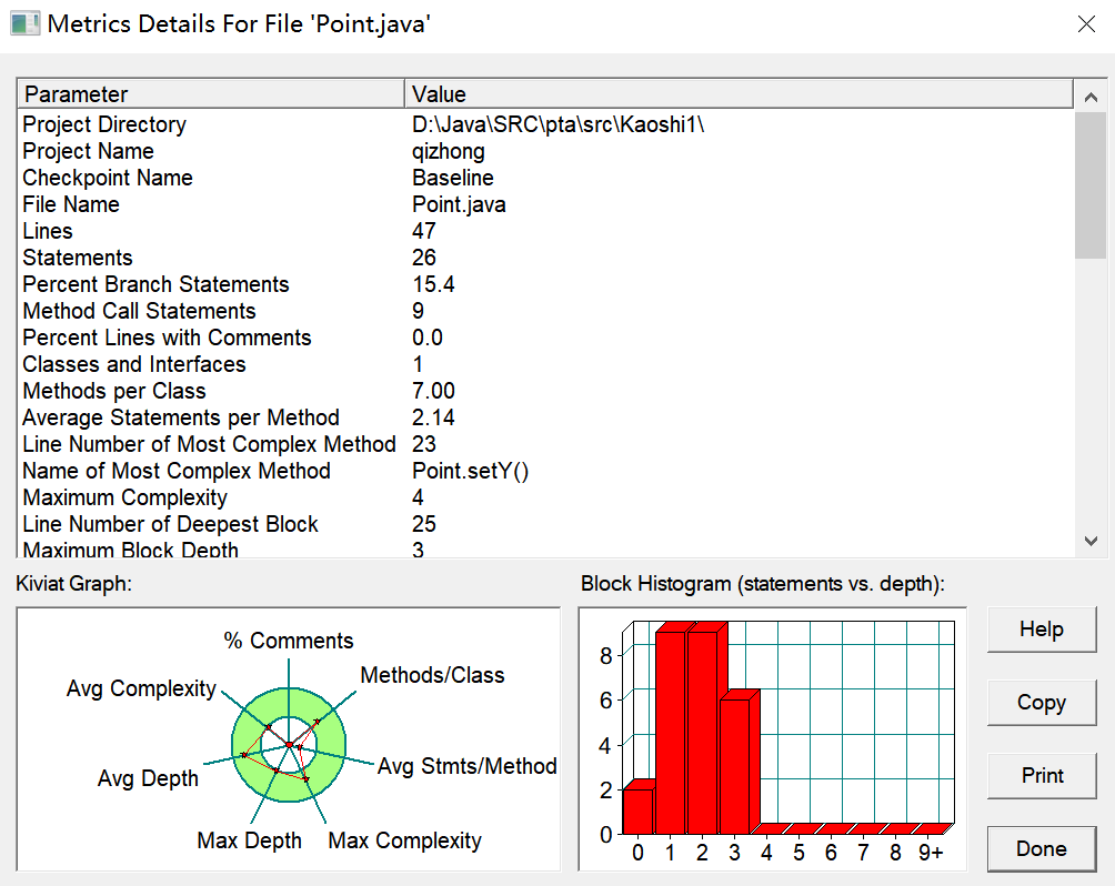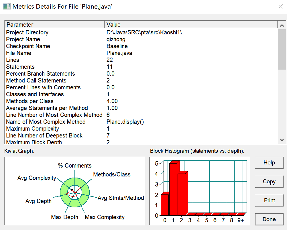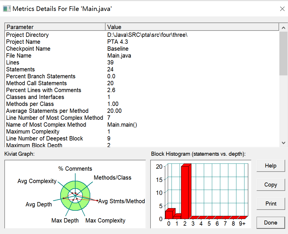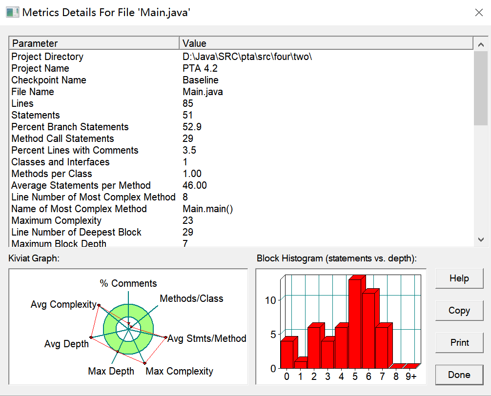 由图可见,本题共使用了三个类,多个方法体,但多个类的注释均过少,Way类甚至未添加注释,三个类所含方法体或过多或过少,且Main类包含的语句数目过多,最大圈复杂度亦为或过大或过小,未能在合理范围内。Main类最大函数深度略大,平均函数深度过大,平均圈复杂度过大。Four类最大函数深度较好,但平均函数深度较大,平均圈复杂度也较大。Way类最大函数深度较小,平均函数深度较小,平均圈复杂度较小。