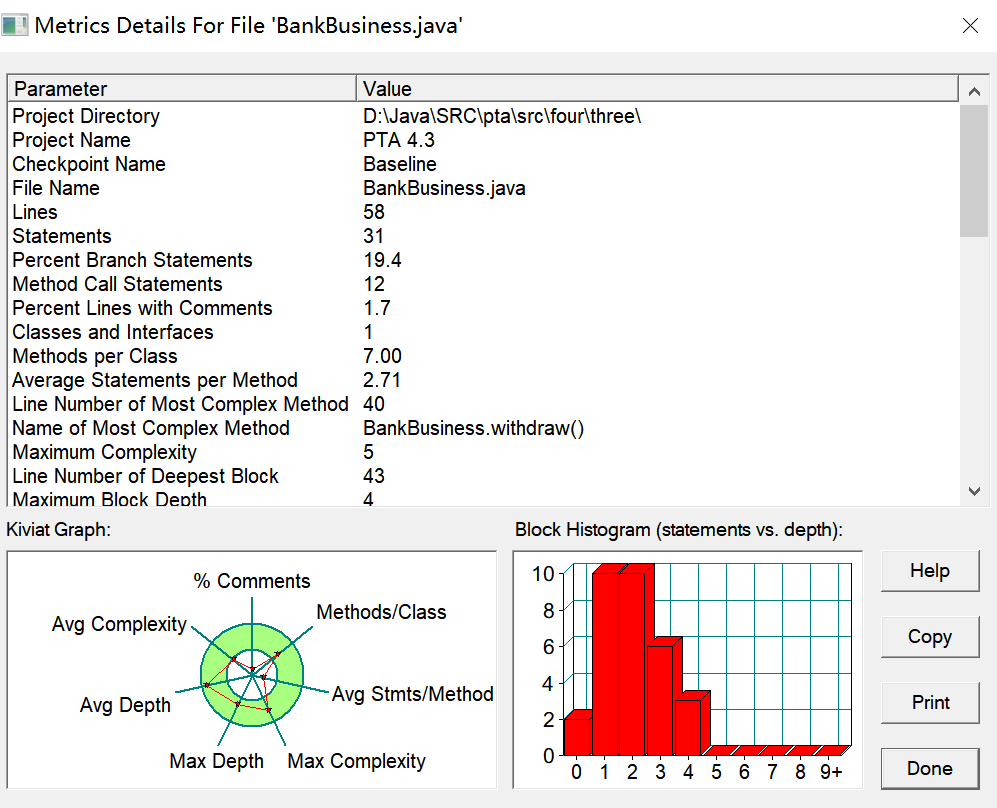 由图可见,本题使用了两个类,多个方法体,且在两个类中注释均过少。在Main类中包含的语句数目过多,但最大圈复杂度过小,最大函数深度过小,平均圈复杂度过大,仅有平均函数深度较为合适。因本题所要实现的功能较多,故将主体代码放入Main类中,与银行功能有关的代码均放在BankBusiness类中,BankBusiness类仅有平均每一方法所含语句数较少,其余性能都较为合适,总体而言结构较为合理。
