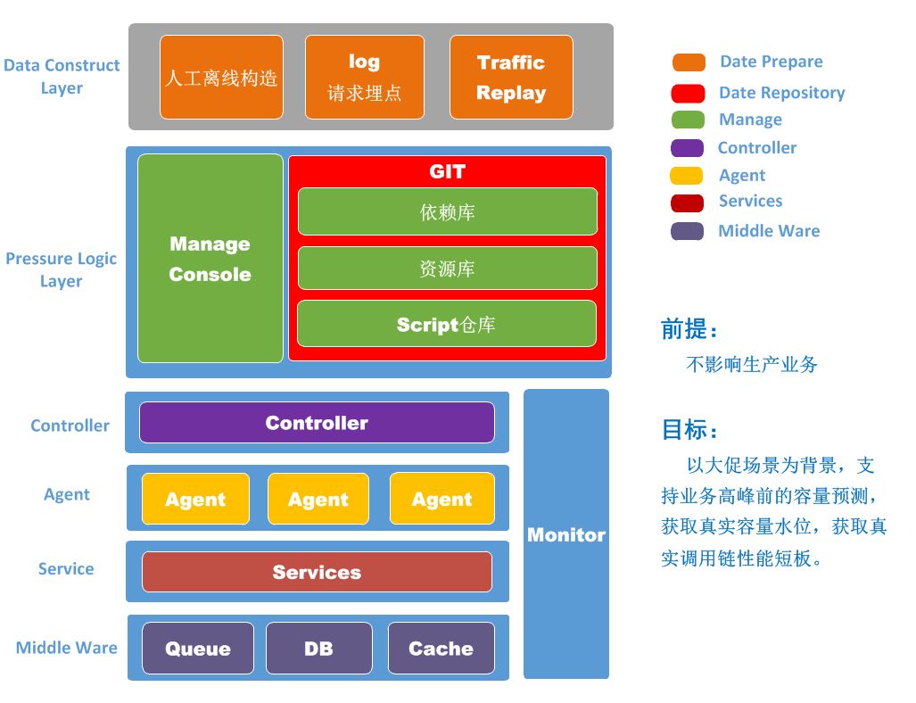 整个系统设计主要以大促作为主要背景,模拟真实生产数据以及依赖发起较大压力的性能测试,支持进行高峰容量预测,获取真实业务容量以及核心调用链性能短板。