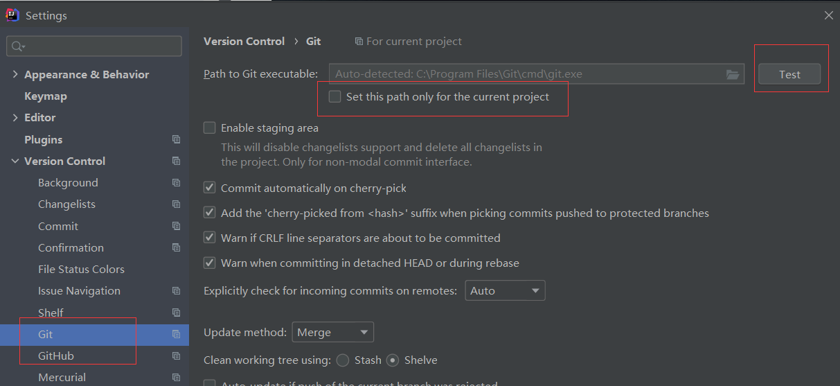 - Version Control --- Git Path to Git executable 选择Set this path only for the current project,点击test