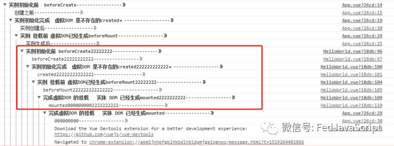 上图带222 的 是为子组件,所以一次顺序是为 先创建父组件,然后才穿件子组件,当子组件创建完成并且实体dom挂载完成后父组件才挂载完成